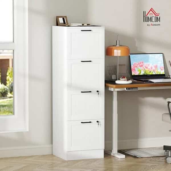 VASAGLE Meuble de Bureau, Meuble de Rangement, Support pour Imprimante, avec 4 Tiroirs Verrouillables, Tringles Réglables, Compatible avec Formats A4, Blanc Nuage OFC082W02Grande capacité : Les 4 tiroirs spacieux, pouvant chacun contenir jusqu’à 130 dossiers, permettent un classement méthodique et un accès rapide à l’ensemble de vos documents Compatible dossiers format A4 : Chaque tiroir dispose d’une tringle ajustable qui s’adapte parfaitement aux dossiers suspendus de diverses dimensions Rangement sécurisé : Les 4 tiroirs du support pour imprimante peuvent être verrouillés individuellement et disposent chacun de 2 clés, afin que vos documents soient toujours protégés Robuste, stable et sûr : Fabriqué en panneaux d’aggloméré et MDF, ce caisson verrouillable est solide, chaque tiroir pouvant supporter jusqu’à 15 kg. Les 2 dispositifs anti-basculement inclus renforcent la stabilité et la sécurité Sobre et élégant : Avec son design simple et moderne, ce meuble de bureau apporte une touche d’élégance contemporaine à votre intérieur et s’intègre facilement aussi bien dans un bureau professionnel que dans un espace de travail à domicile
